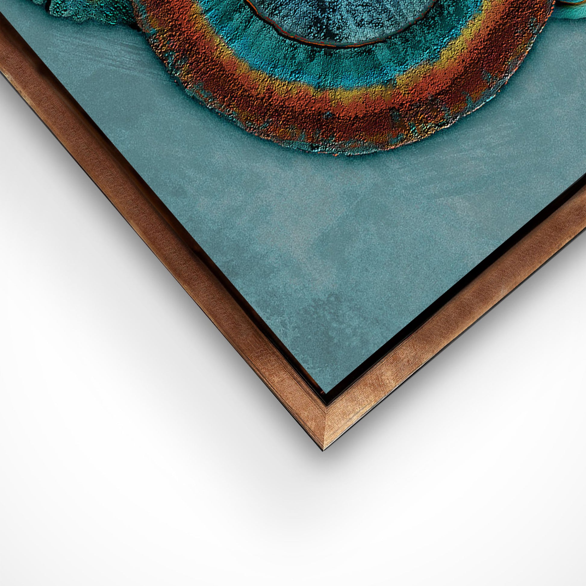 Rust, teal, aqua and soft copper tones drift through layered circular forms, creating a calm, flowing movement within this contemporary abstract artwork. This piece is influenced by the geological compounds of copper and iron gently running through the mineral-rich rocks and soil of streams and rivers — elements shaped by flow, erosion, heat and time. Perfect for serene, modern interiors seeking gentle rhythm, calmness and depth. The layered forms and shifting tones hold a sense of flow and spaciousness — a reminder to pause and breathe.