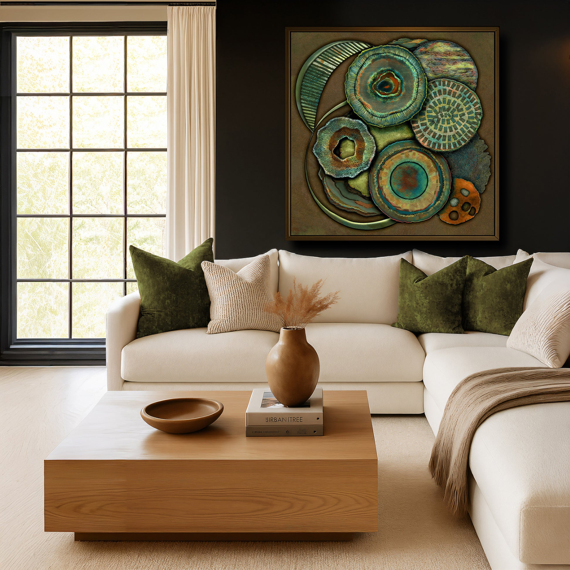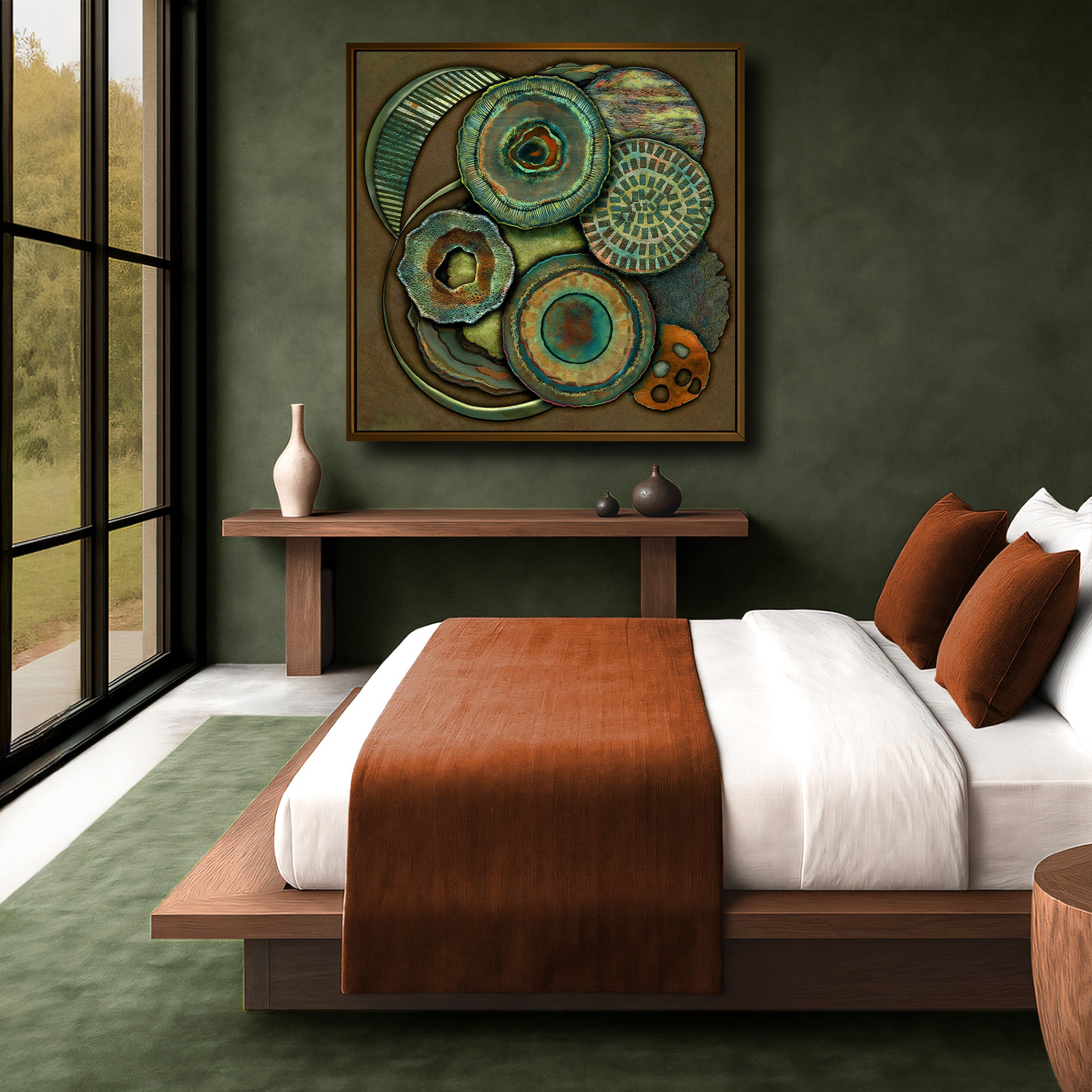 Deep greens and burnished copper tones are reminiscent of earthy roots and rich forest canopies in this modern, nature-inspired abstract print. A piece shaped by resilience and quiet depth — a reflection on what time leaves behind.